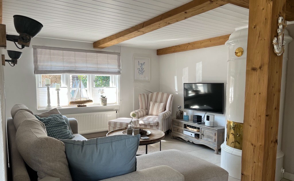 Der Wohnbereich besteht aus einem gemütlichen Ecksofa (ausziehbar), einem Ohren-Sessel incl. Fußhocker, SAT-TV und einer Bose Bluetooth-Box. Durch freigelegte Balken, die niedrige Deckenhöhe, sowie der Kombination aus Landhaustil und Moderne, entsteht eine sehr gemütliche Wohnatmosphäre – einfach zum Wohlfühlen. Seit dem Winter 2023 ist ein historischer Kachelofen für gemütliche Stunden und zum Verweilen im Wohn- und Küchenbereich vorhanden.