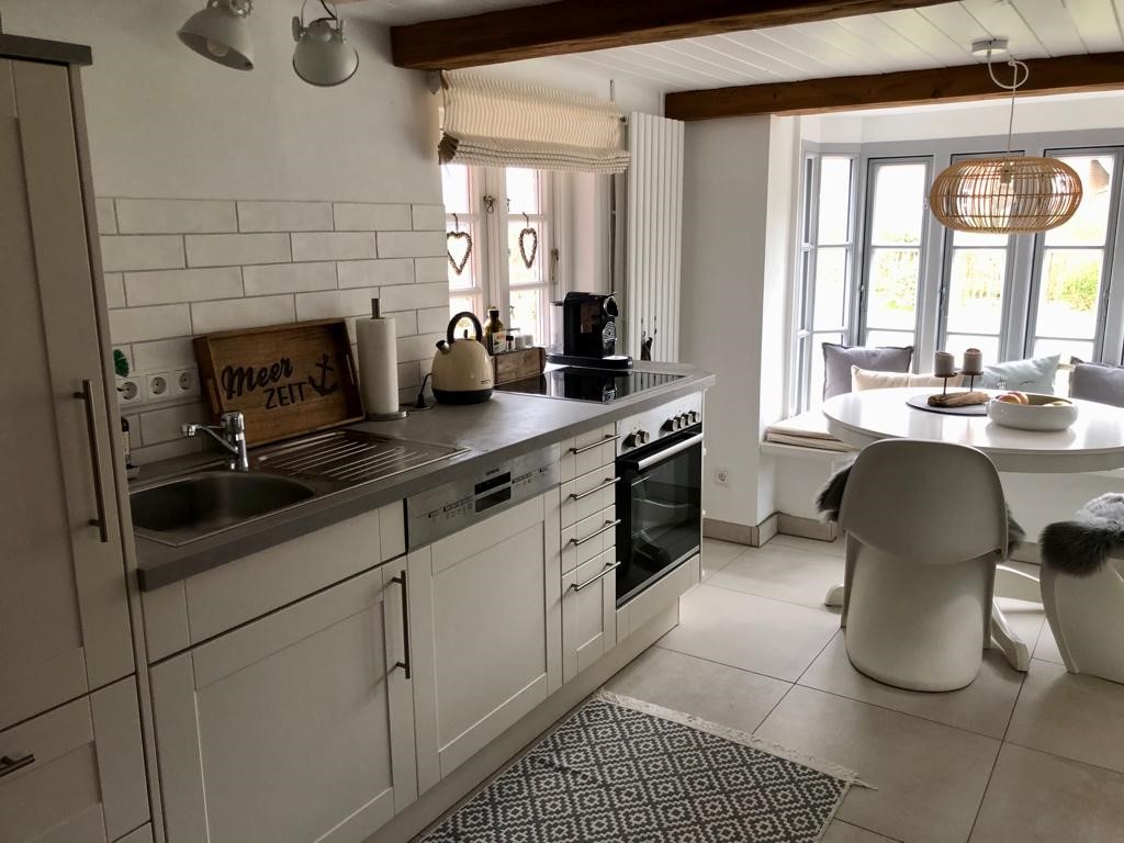 Im Erdgeschoss befindet sich ein offener Wohnraum mit schöner Küche und gemütlichen Sitzplätze direkt im Erker. Von dort hast du einen herrlichen Blick in den Garten. Die Küche ist mit allem sehr gut ausgestattet und besitzt einen E-Herd incl. Backofen, Kühlschrank mit Eisfach, Spülmaschine, Kaffeemaschine (Nespresso Kapselmaschine und normale Filtermaschine), sowie Wasserkochen und Toaster. Darüber hinaus auch einen Elektro-Tischgrill, wie auch ein Waffeleisen u.v.m..